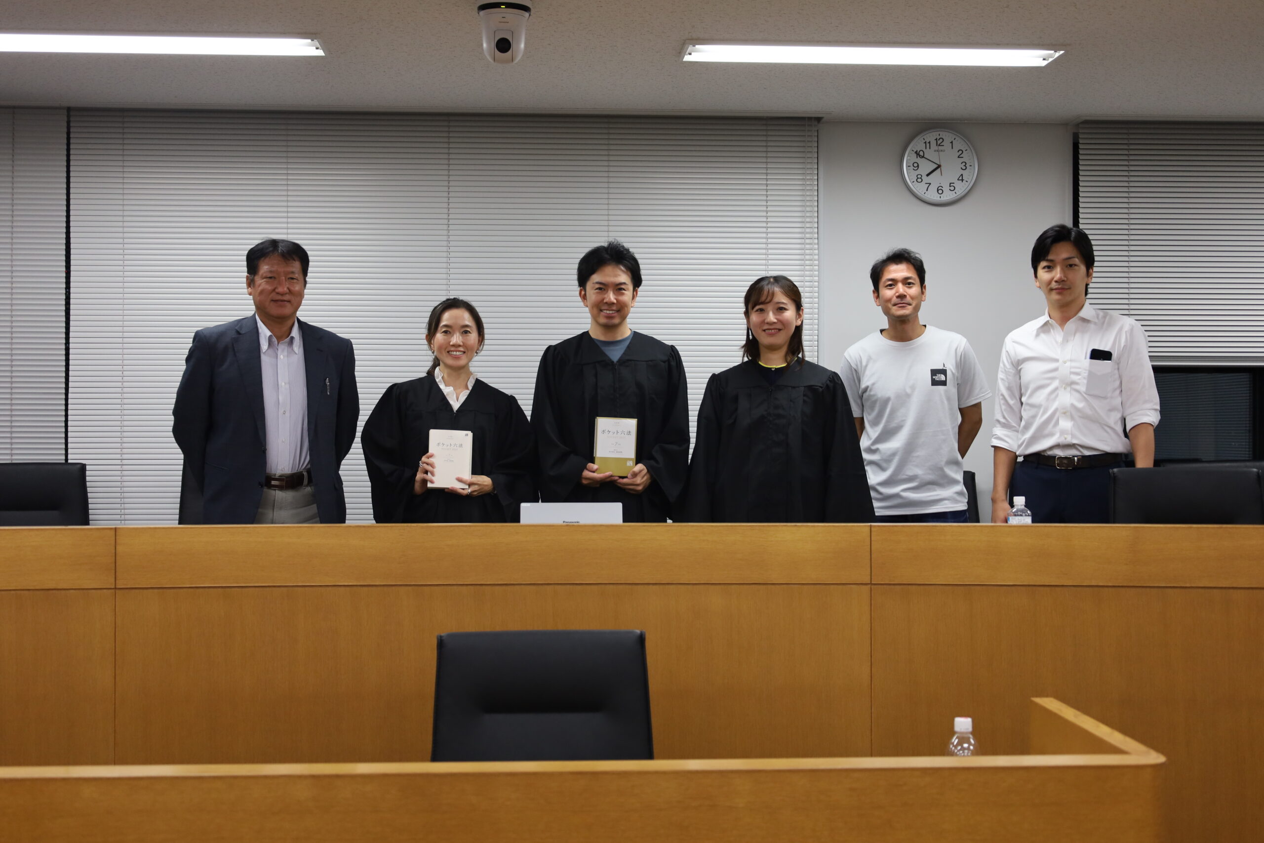 当日は、弁護士資格をもつ教員2名と、スポーツウエルネスマネジメント分野の教員1名が、法衣を着用して裁判官役を務めました。