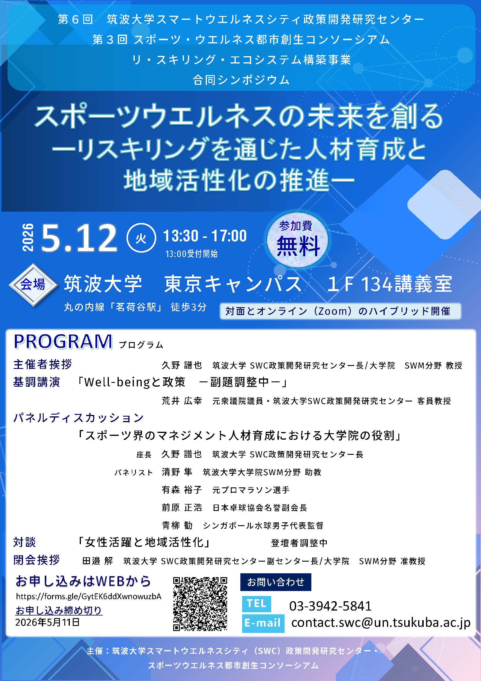 第3回スポーツ・ウエルネス都市創生コンソーシアムシンポジウムを2026年5月12日(火)に開催いたします。スマートウエルネスシティ政策開発研究センターと共同開催でございます。